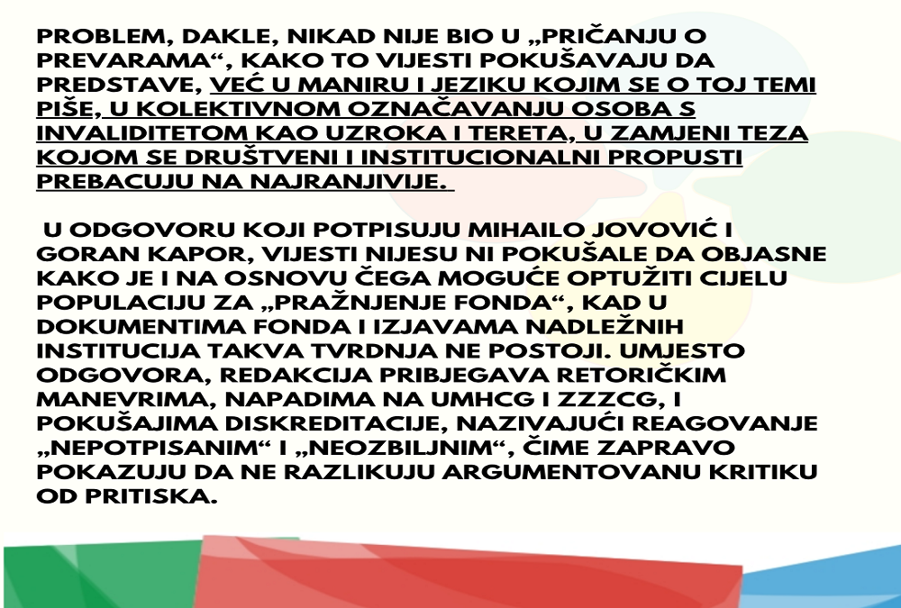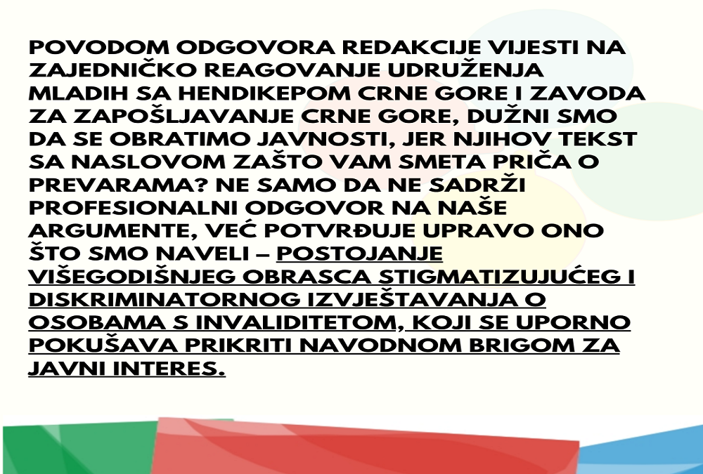 Povodom odgovora redakcije Vijesti na zajedničko reagovanje Udruženja mladih sa hendikepom Crne Gore i Zavoda za zapošljavanje Crne Gore, dužni smo da se obratimo javnosti, jer njihov tekst sa naslovom Zašto vam smeta priča o prevarama? ne samo da ne sadrži profesionalni odgovor na naše argumente, već potvrđuje upravo ono što smo naveli – postojanje višegodišnjeg obrasca stigmatizujućeg i diskriminatornog izvještavanja o osobama s invaliditetom, koji se uporno pokušava prikriti navodnom brigom za javni interes.