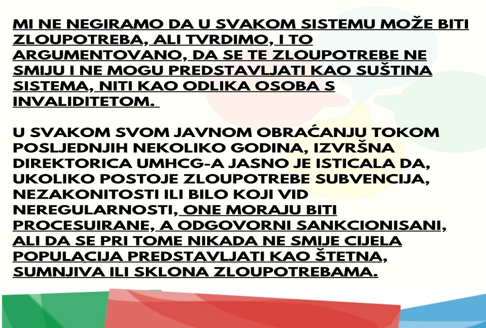 Mi ne negiramo da u svakom sistemu može biti zloupotreba, ali tvrdimo, i to argumentovano, da se te zloupotrebe ne smiju i ne mogu predstavljati kao suština sistema, niti kao odlika osoba s invaliditetom. U svakom svom javnom obraćanju tokom posljednjih nekoliko godina, izvršna direktorica UMHCG-a jasno je isticala da, ukoliko postoje zloupotrebe subvencija, nezakonitosti ili bilo koji vid neregularnosti, one moraju biti procesuirane, a odgovorni sankcionisani, ali da se pri tome nikada ne smije cijela populacija predstavljati kao štetna, sumnjiva ili sklona zloupotrebama.