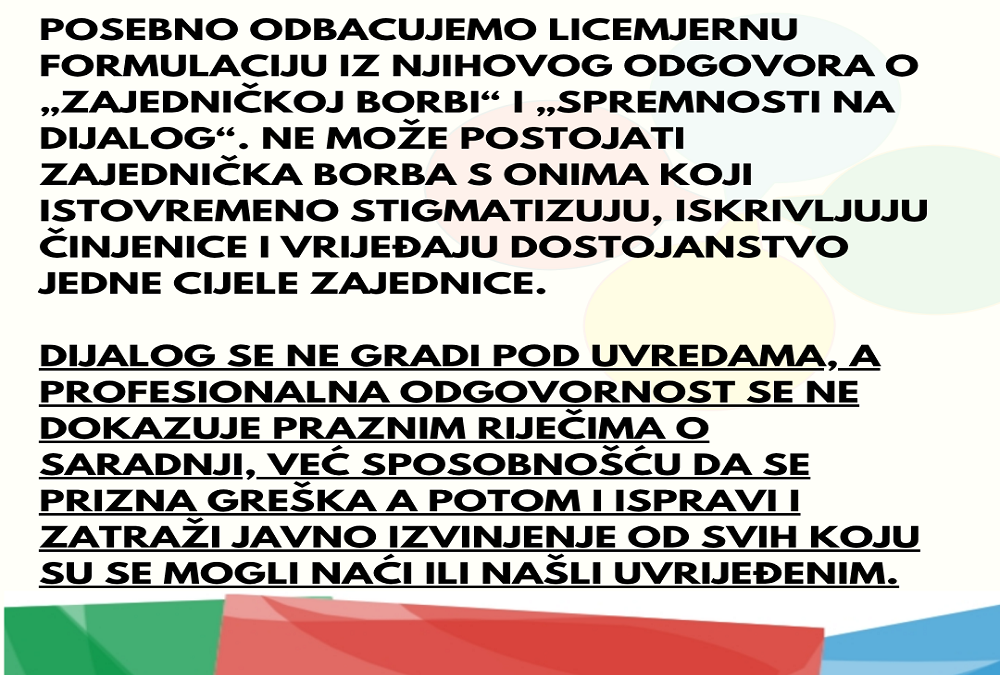 Posebno odbacujemo licemjernu formulaciju iz njihovog odgovora o „zajedničkoj borbi“ i „spremnosti na dijalog“. Ne može postojati zajednička borba s onima koji istovremeno stigmatizuju, iskrivljuju činjenice i vrijeđaju dostojanstvo jedne cijele zajednice. Dijalog se ne gradi pod uvredama, a profesionalna odgovornost se ne dokazuje praznim riječima o saradnji, već sposobnošću da se prizna greška - a potom i ispravi i zatraži javno izvinjenje od svih koju su se mogli naći ili našli uvrijeđenim.