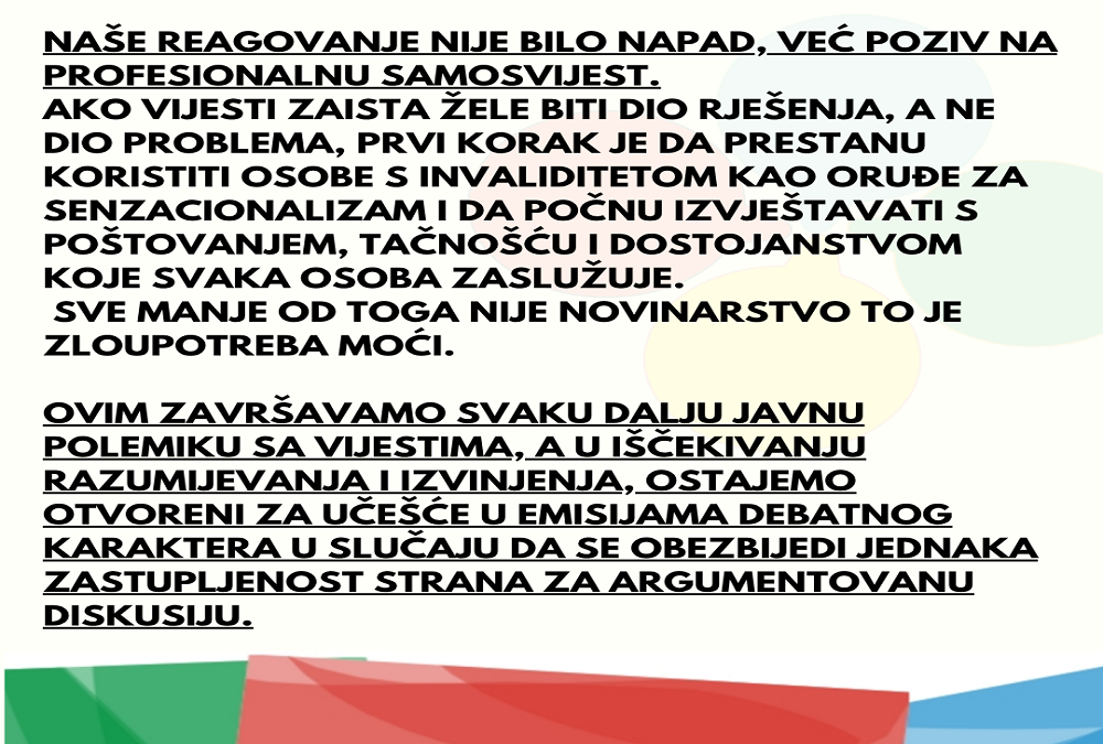 Ovaj odgovor Vijesti nije ni ispravka, ni objašnjenje, ni poziv na dijalog, već nastavak istog obrasca. Kroz njega se jasno vidi da redakcija ne prepoznaje odgovornost koju ima prema javnosti, niti razumije težinu riječi kojima oblikuje društveni odnos prema osobama s invaliditetom.