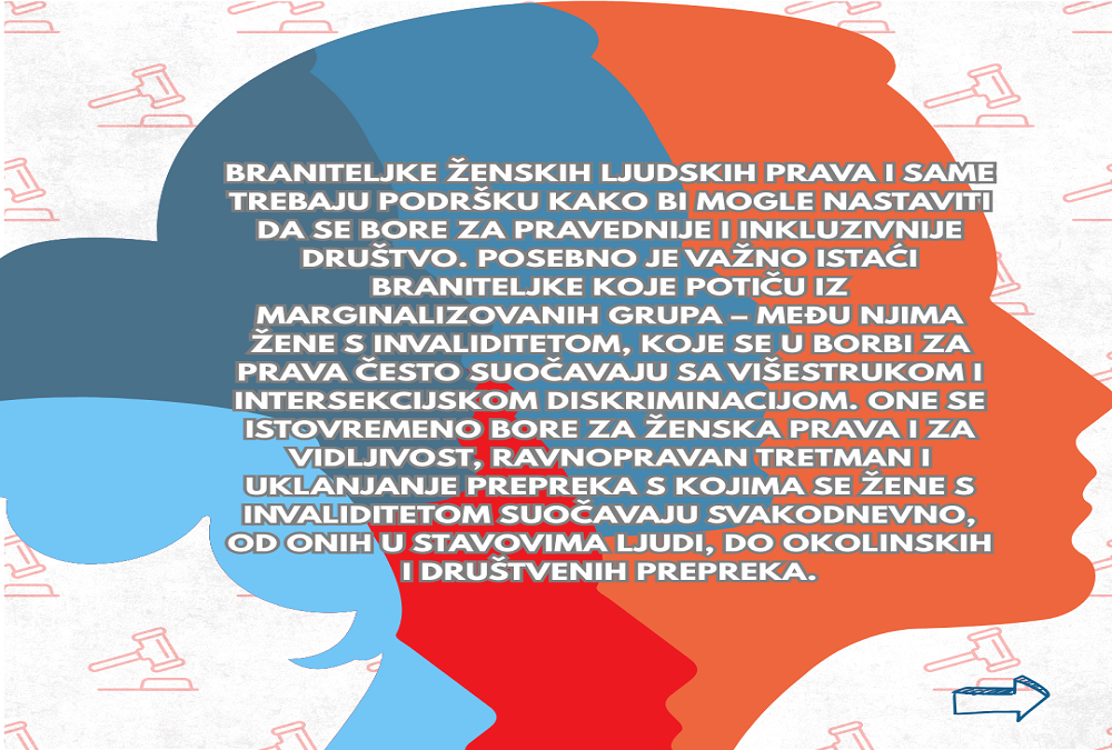Braniteljke ženskih ljudskih prava i same trebaju podršku kako bi mogle nastaviti da se bore za pravednije i inkluzivnije društvo. Posebno je važno istaći braniteljke koje potiču iz marginalizovanih grupa – među njima žene s invaliditetom, koje se u borbi za prava često suočavaju sa višestrukom i intersekcijskom diskriminacijom. One se istovremeno bore za ženska prava i za vidljivost, ravnopravan tretman i uklanjanje prepreka s kojima se žene s invaliditetom suočavaju svakodnevno, od onih u stavovima ljudi, do okolinskih i društvenih prepreka.