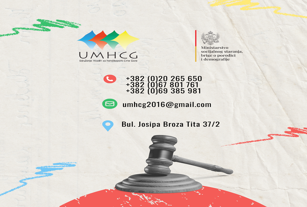 Shodno navedenom, Udruženje mladih sa hendikepom Crne Gore (UMHCG) pruža Besplatnu pravnu pomoć za djecu i roditelje s invaliditetom i članove/ice njihovih porodica u cilju osiguranja pristupa besplatnoj, pravovremenoj, kvalitetnoj i kontinuiranoj pravnoj podršci, kako bi se djeca i roditelji s invaliditetom, te članovi/ice njihovih porodica mogli informisati o svojim pravima, aktivno ih ostvarivati i zaštititi u slučajevima povrede.