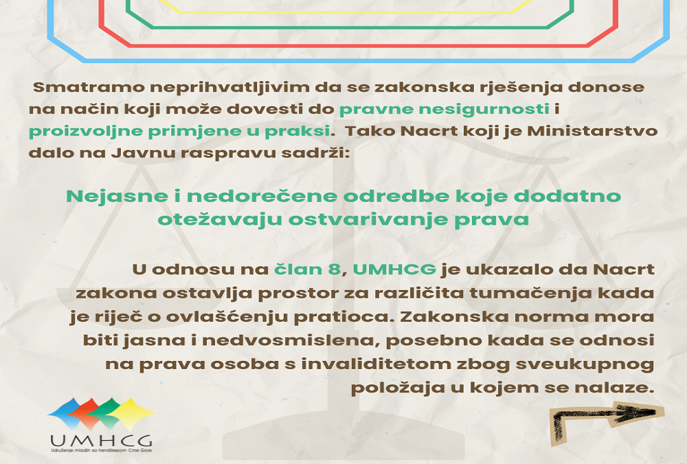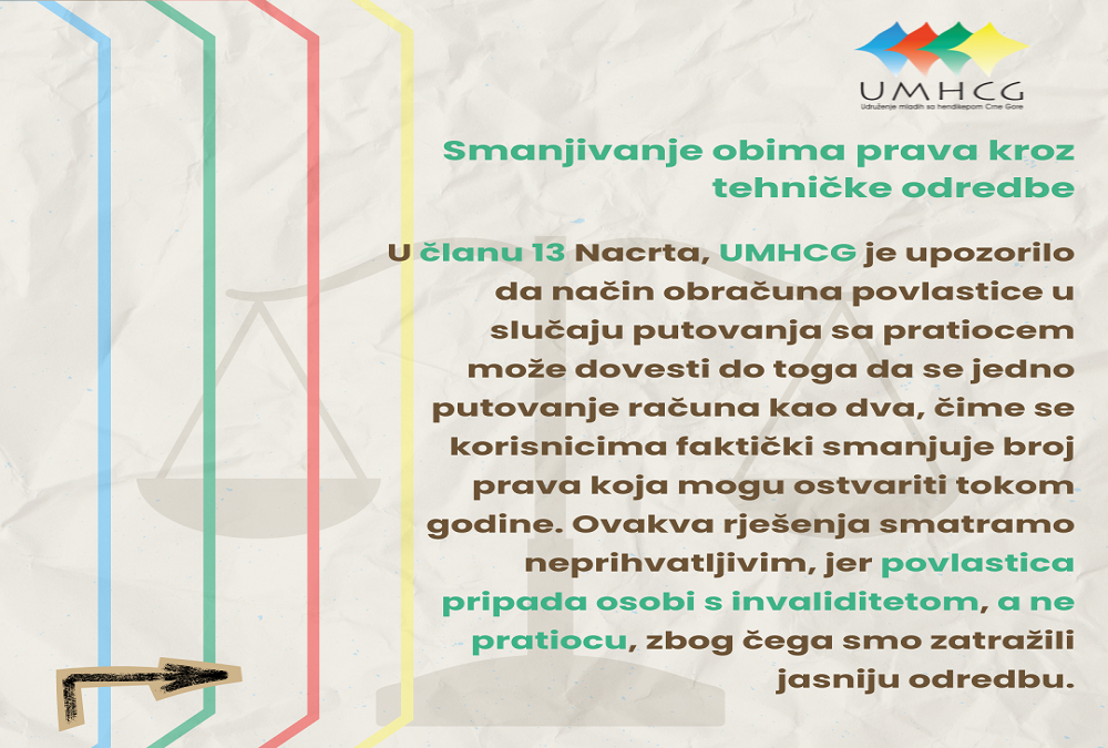 Udruženje mladih sa hendikepom Crne Gore (UMHCG) dostavilo je Ministarstvu socijalnog staranja, brige o porodici i demografije detaljne primjedbe, predloge i sugestije na Nacrt zakona o povlasticama na putovanje lica sa invaliditetom, ukazujući na niz rješenja koja su nepravedna, neprecizna ili u suprotnosti sa principima ljudskih prava i načelima Konvencije UN o pravima osoba s invaliditetom.