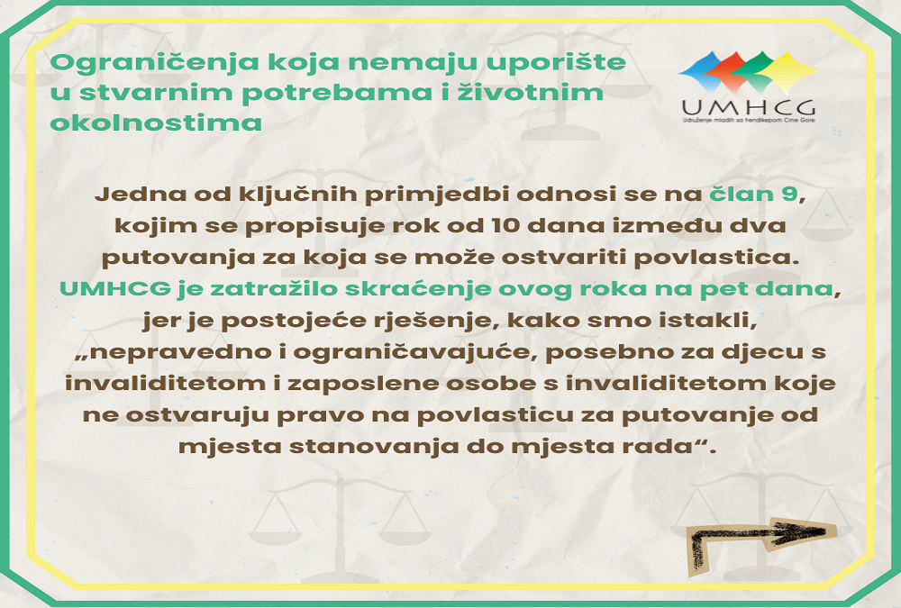 Jedna od ključnih primjedbi odnosi se na član 9, kojim se propisuje rok od 10 dana između dva putovanja za koja se može ostvariti povlastica. UMHCG je zatražilo skraćenje ovog roka na pet dana, jer je postojeće rješenje, kako smo istakli, „nepravedno i ograničavajuće, posebno za djecu s invaliditetom i zaposlene osobe s invaliditetom koje ne ostvaruju pravo na povlasticu za putovanje od mjesta stanovanja do mjesta rada“. Naglasili smo da ovakvo ograničenje ne donosi budžetske uštede, ali značajno otežava život onima kojima je povlastica namijenjena.