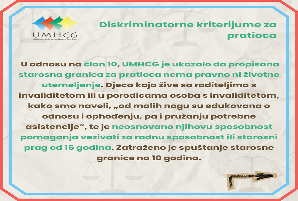 U odnosu na član 10, UMHCG je ukazalo da propisana starosna granica za pratioca nema pravno ni životno utemeljenje. Djeca koja žive sa roditeljima s invaliditetom ili u porodicama osoba s invaliditetom, kako smo naveli, „od malih nogu su edukovana o odnosu i ophođenju, pa i pružanju potrebne asistencije“, te je neosnovano njihovu sposobnost pomaganja vezivati za radnu sposobnost ili starosni prag od 15 godina. Zatraženo je spuštanje starosne granice na 10 godina.