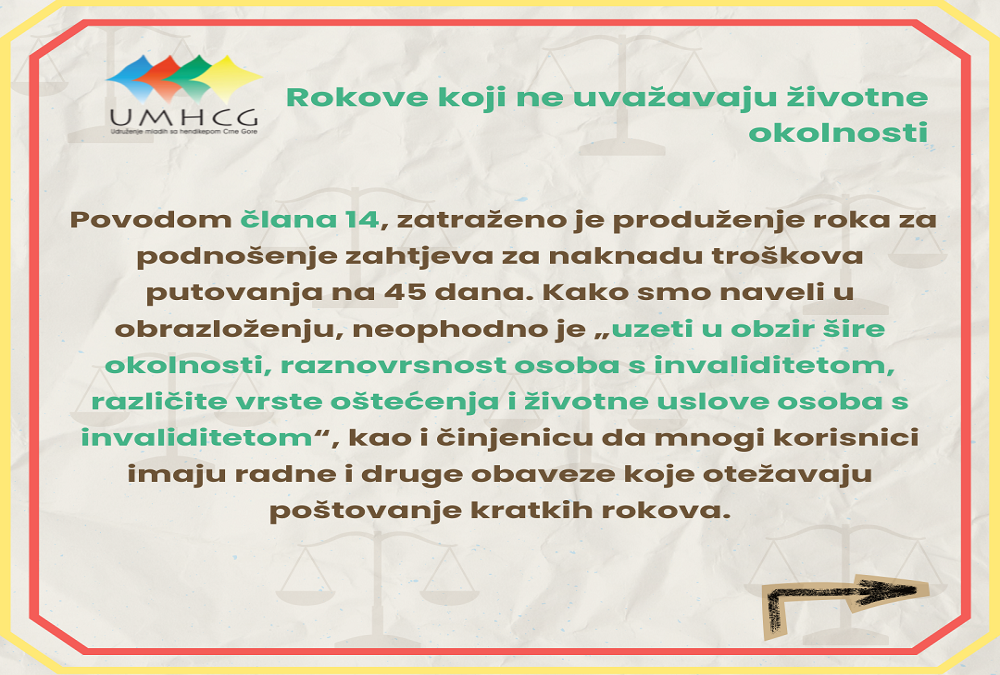 Povodom člana 14, zatraženo je produženje roka za podnošenje zahtjeva za naknadu troškova putovanja na 45 dana. Kako smo naveli u obrazloženju, neophodno je „uzeti u obzir šire okolnosti, raznovrsnost osoba s invaliditetom, različite vrste oštećenja i životne uslove osoba s invaliditetom“, kao i činjenicu da mnogi korisnici imaju radne i druge obaveze koje otežavaju poštovanje kratkih rokova.