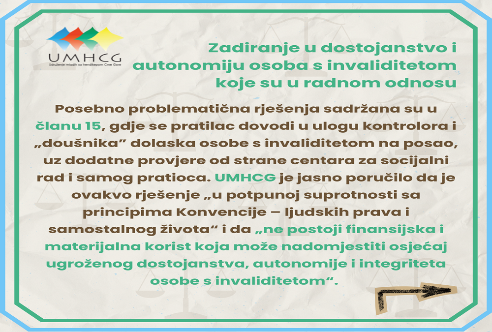 Posebno problematična rješenja sadržana su u članu 15, gdje se pratilac dovodi u ulogu kontrolora i „doušnika” dolaska osobe s invaliditetom na posao, uz dodatne provjere od strane centara za socijalni rad i samog pratioca. UMHCG je jasno poručilo da je ovakvo rješenje „u potpunoj suprotnosti sa principima Konvencije – ljudskih prava i samostalnog života“ i da „ne postoji finansijska i materijalna korist koja može nadomjestiti osjećaj ugroženog dostojanstva, autonomije i integriteta osobe s invaliditetom“. Zbog toga je zatraženo brisanje spornih stavova.