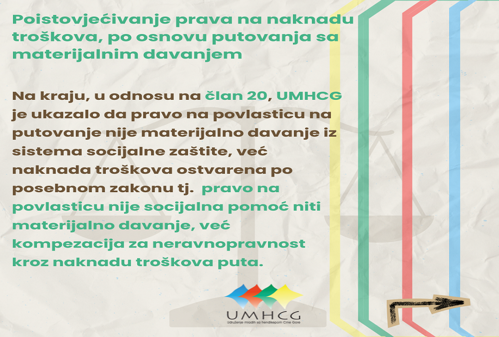 Na kraju, u odnosu na član 20, UMHCG je ukazalo da pravo na povlasticu na putovanje nije materijalno davanje iz sistema socijalne zaštite, već naknada troškova ostvarena po posebnom zakonu. Zbog toga je neophodno koristiti pravno ispravnu terminologiju i prilikom eventualnog povraćaja sredstava uzeti u obzir stvarni materijalni položaj korisnika, a ne socijalni položaj, kako je navedeno. Pravo na povlasticu nije socijalna pomoć niti materijalno davanje, već kompezacija za neravnopravnost kroz naknadu troškova puta.