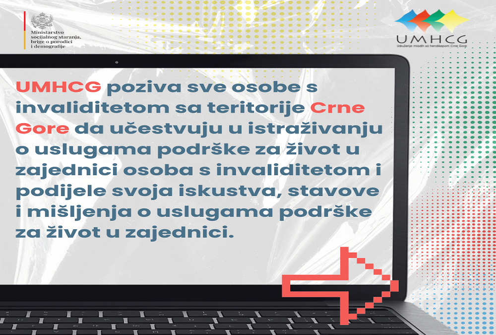 Udruženje mladih sa hendikepom Crne Gore (UMHCG) poziva sve osobe s invaliditetom sa teritorije Crne Gore da učestvuju u istraživanju o uslugama podrške za život u zajednici osoba s invaliditetom i podijele svoja iskustva, stavove i mišljenja o uslugama podrške za život u zajednici.
