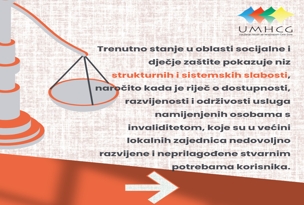 Osobe s invaliditetom i njihove porodice često djeluju u uslovima sistema koji je fragmentisan, u kojem je podrška teško dostupna i nedovoljno prilagođena njihovoj svakodnevici. Jedan od dominantnih izazova s kojima se roditelji susrijeću su neefikasna komunikacija s institucijama sistema, neažurnost, nedostatak jasnih informacija i prebacivanje odgovornosti između institucija, što direktno utiče na kvalitet njihovog života i stepen socijalne inkluzije. Usluge podrške za život u zajednici, uključujući personalnu asistenciju, stanovanje uz podršku i druge oblike individualizovane podrške, nijesu adekvatno razvijene niti sistemski podržane, zbog čega veliki broj osoba s invaliditetom ostaje u institucijama ili u drugim restriktivnim okruženjima, bez stvarnih mogućnosti za učešće u zajednici. Sistem socijalne i dječje zaštite ostaje neujednačen, reaktivan i nedovoljno odgovoran prema stvarnim potrebama korisnika/ca, posebno osoba s invaliditetom, dok nedostatak preciznog mapiranja socijalnih potreba onemogućava strateško planiranje i ravnomjernu teritorijalnu pokrivenost usluga.