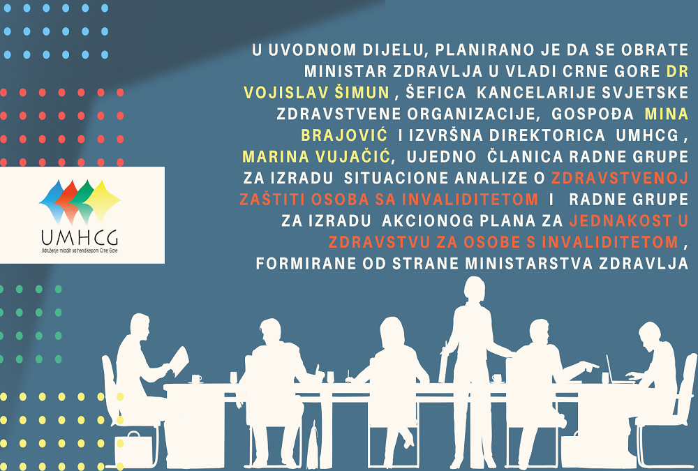 U uvodnom dijelu, planirano je da se obrate ministar zdravlja u Vladi Crne Gore dr Vojislav Šimun, šefica Kancelarije Svjetske zdravstvene organizacije, gospođa Mina Brajović i izvršna direktorica UMHCG, Marina Vujačić, ujedno članica Radne grupe za izradu Situacione analize o zdravstvenoj zaštiti osoba sa invaliditetom i Radne grupe za izradu Akcionog plana za jednakost u zdravstvu za osobe s invaliditetom, formirane od strane Ministarstva zdravlja. Nakon uvodnih obraćanja, slijedi diskusija u okviru koje će prisutni predstavnici/e nadležnih resora u Vladi, zdravstvenih institucija, organizacija osoba s invaliditetom i udruženja roditelja imati priliku da se uključe i postave pitanja, odnosno daju svoj osvrt na pitanje zdravstvene njege i zaštite osoba s invaliditetom.
