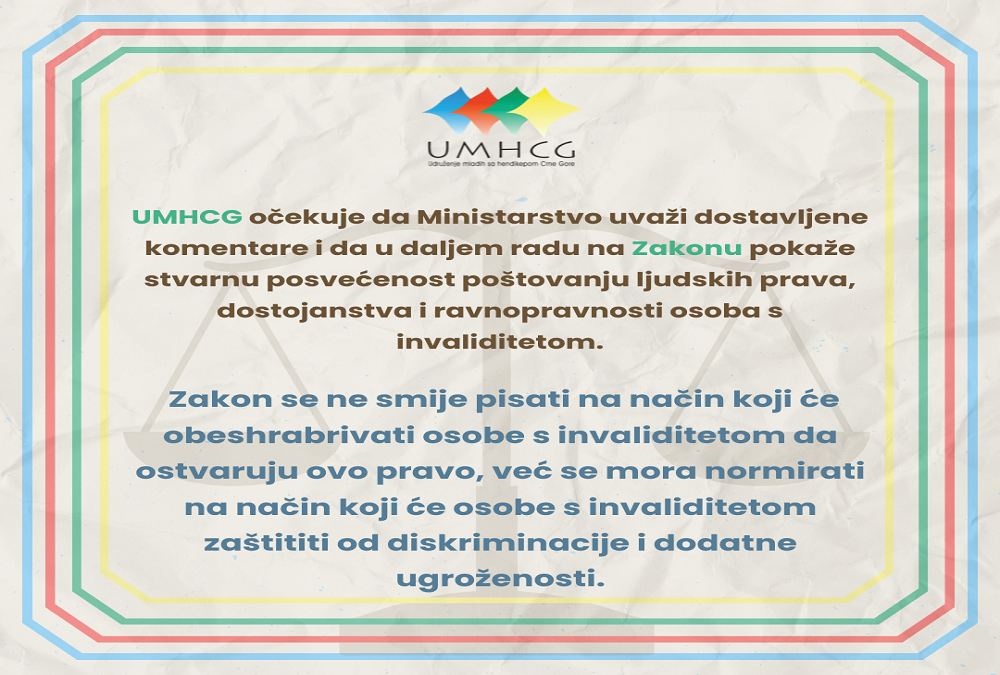 UMHCG očekuje da Ministarstvo uvaži dostavljene komentare i da u daljem radu na Zakonu pokaže stvarnu posvećenost poštovanju ljudskih prava, dostojanstva i ravnopravnosti osoba s invaliditetom na čemu ćemo nastaviti da insistiramo i u daljem procesu, a ne samo deklarativno pozivanje na pravednost, dostojanstvo i samostalni život osoba s invaliditetom.