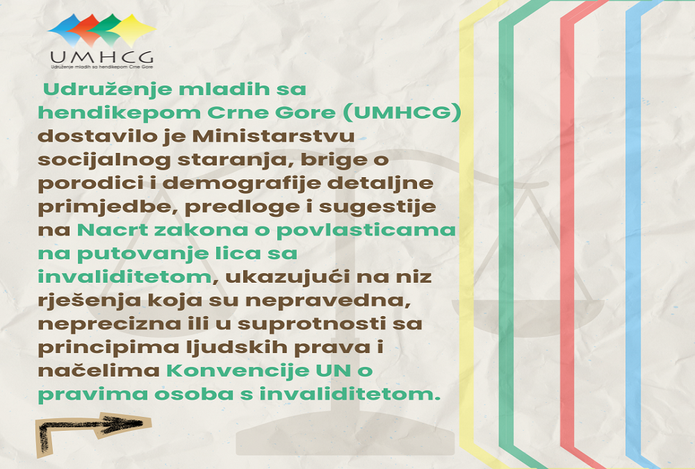 Udruženje mladih sa hendikepom Crne Gore (UMHCG) dostavilo je Ministarstvu socijalnog staranja, brige o porodici i demografije detaljne primjedbe, predloge i sugestije na Nacrt zakona o povlasticama na putovanje lica sa invaliditetom, ukazujući na niz rješenja koja su nepravedna, neprecizna ili u suprotnosti sa principima ljudskih prava i načelima Konvencije UN o pravima osoba s invaliditetom.