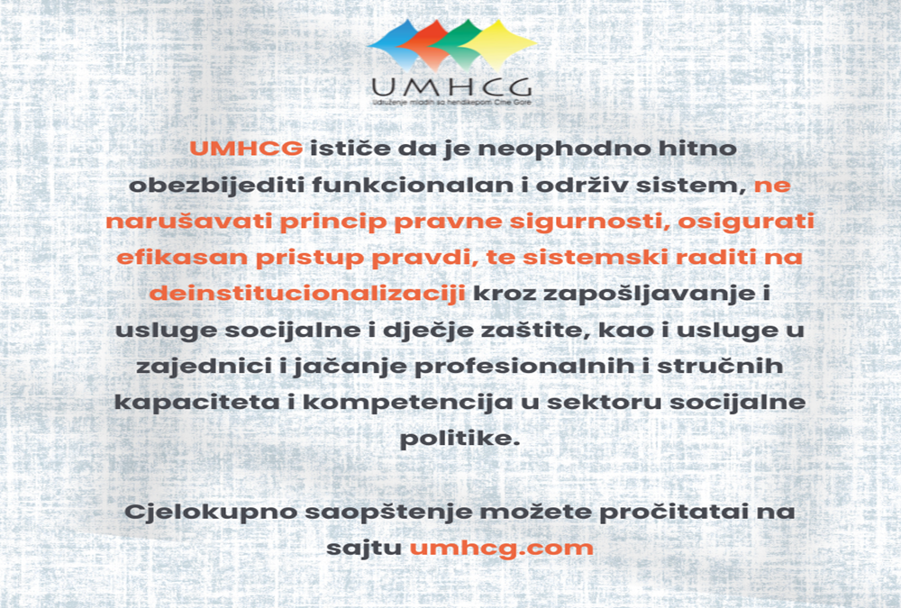 UMHCG ističe da je neophodno hitno obezbijediti funkcionalan i održiv sistem, ne narušavati princip pravne sigurnosti, osigurati efikasan pristup pravdi, te sistemski raditi na deinstitucionalizaciji kroz zapošljavanje i usluge socijalne i dječje zaštite, kao i usluge u zajednici i jačanje profesionalnih i stručnih kapaciteta i kompetencija u sektoru socijalne politike.